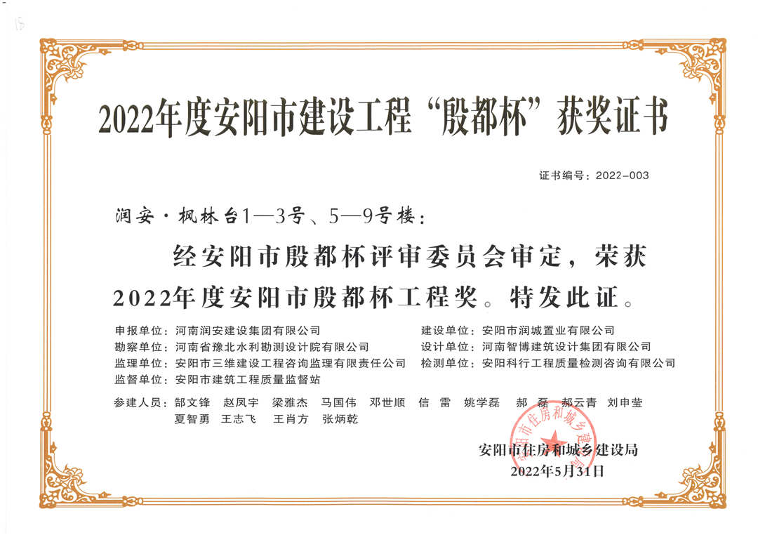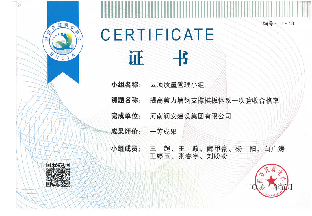 近期,集團公司承建的多個項目捷報頻傳,先后有“林州碧桂園?林語印象項目”,被評為2022年上半年安陽市建筑工程質量標準化示范工地;潤安楓林臺1-3、5-9號樓、林州碧桂園?天璽7號樓榮獲2022年度安陽市殷都杯工程獎。同時,吾悅鴻城質量管理小組、云頂質量管理小組、璽悅質量管理小組申報的三項課題均被河南省建筑業(yè)協(xié)會評為一等成果。